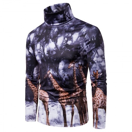 New Men's Plus Size 3D Giraffe Print High Neck Long Sleeve T-Shirt Bottoming Shirt